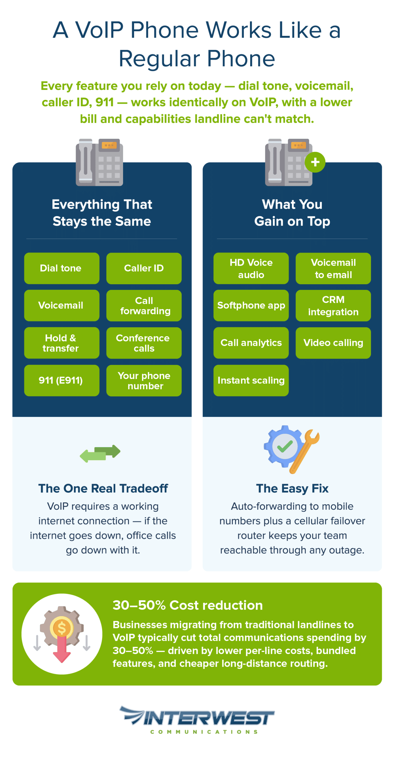 - VoIP works just like a regular phone. You get a dial tone, make and receive calls, use voicemail, caller ID, call forwarding, hold, transfer, and 911 — all with the same experience as a traditional landline.